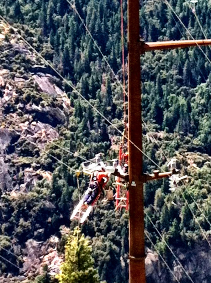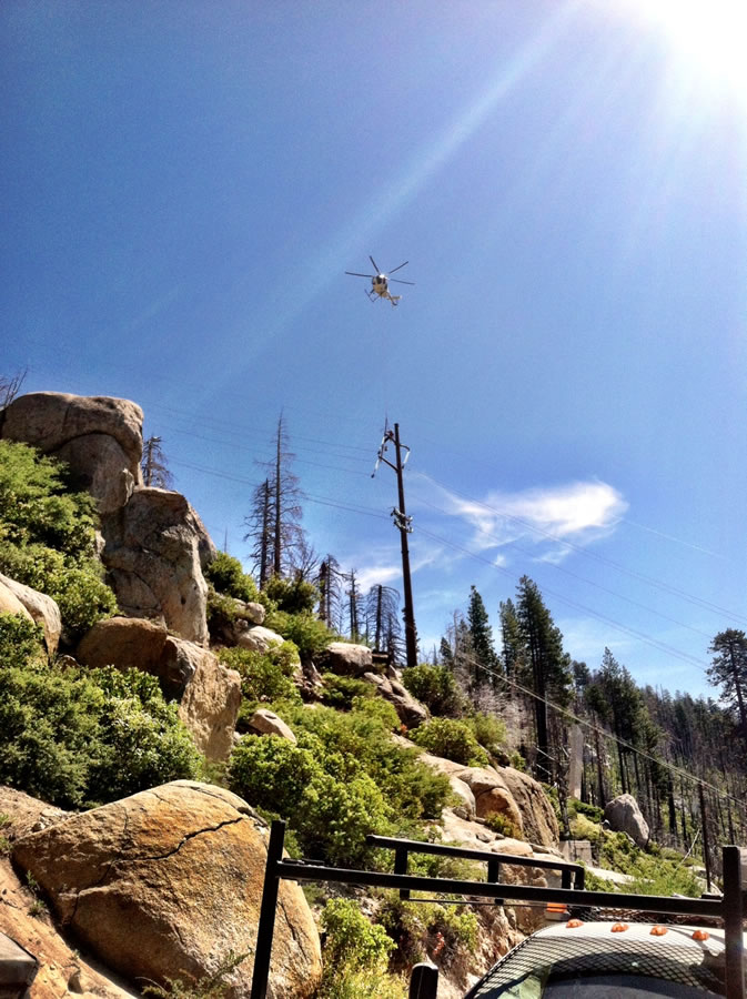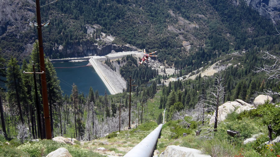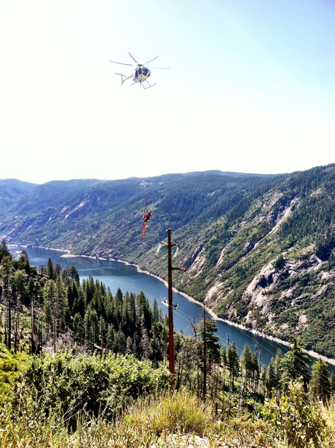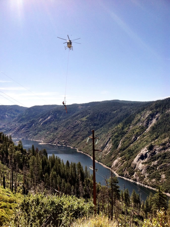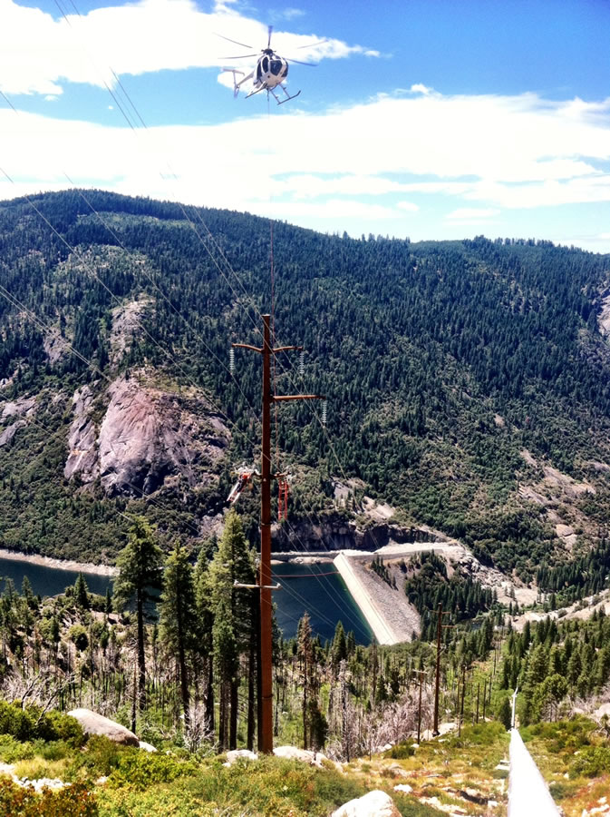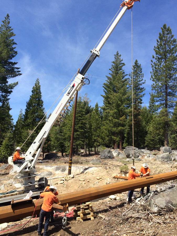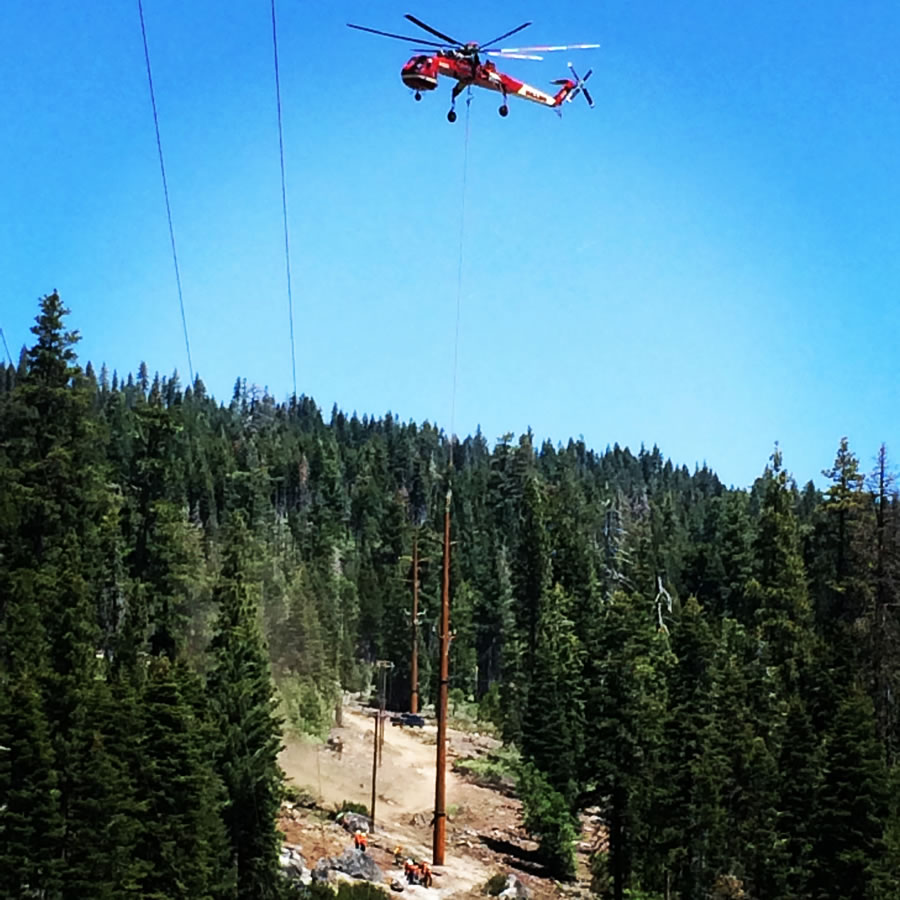 Salt Spring — Lower Bear Rear Reservoir 15/34.5kV Overhead Transmission Project, CAThis project included the construction of 115kV and 34.5kV transmission and distribution lines as well as the removal of an existing 12kV line. Wilson crews worked near Kirkwood, California, from Salt Springs Substation to Lower Bear Reservoir. Crew members were tasked with working around environmentally sensitive habitats home to the peregrine falcon, spotted owl, and nearly-extinct Sierra Nevada yellow-legged frog.