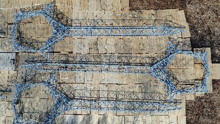 The line design was a guyed delta configuration with 1192.5 ACSR “Bunting” three-bundle conductor. Most structures were lattice steel single-leg guyed towers on helical pile foundations.