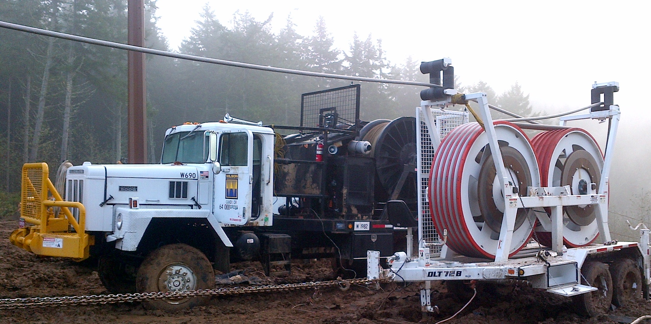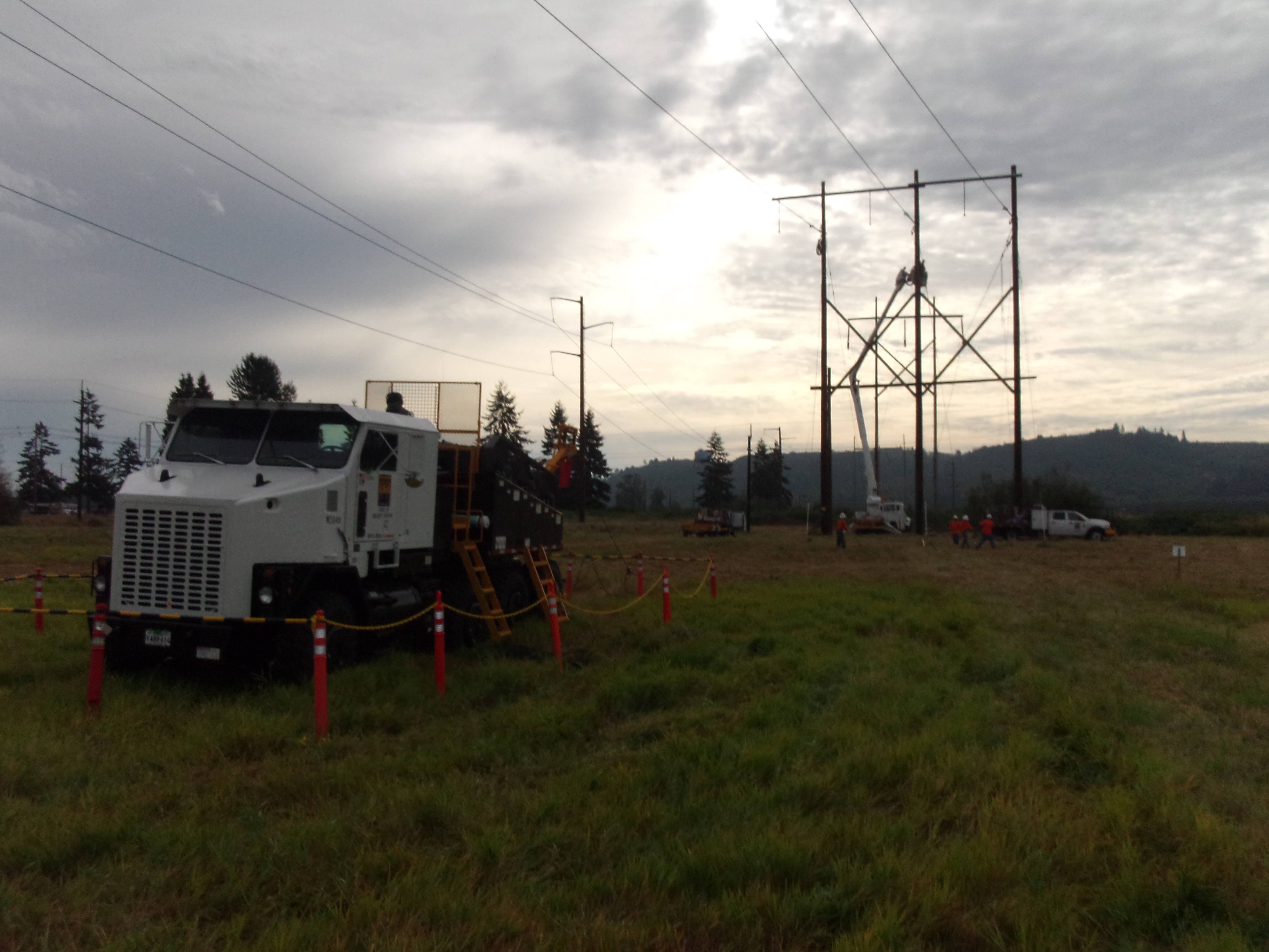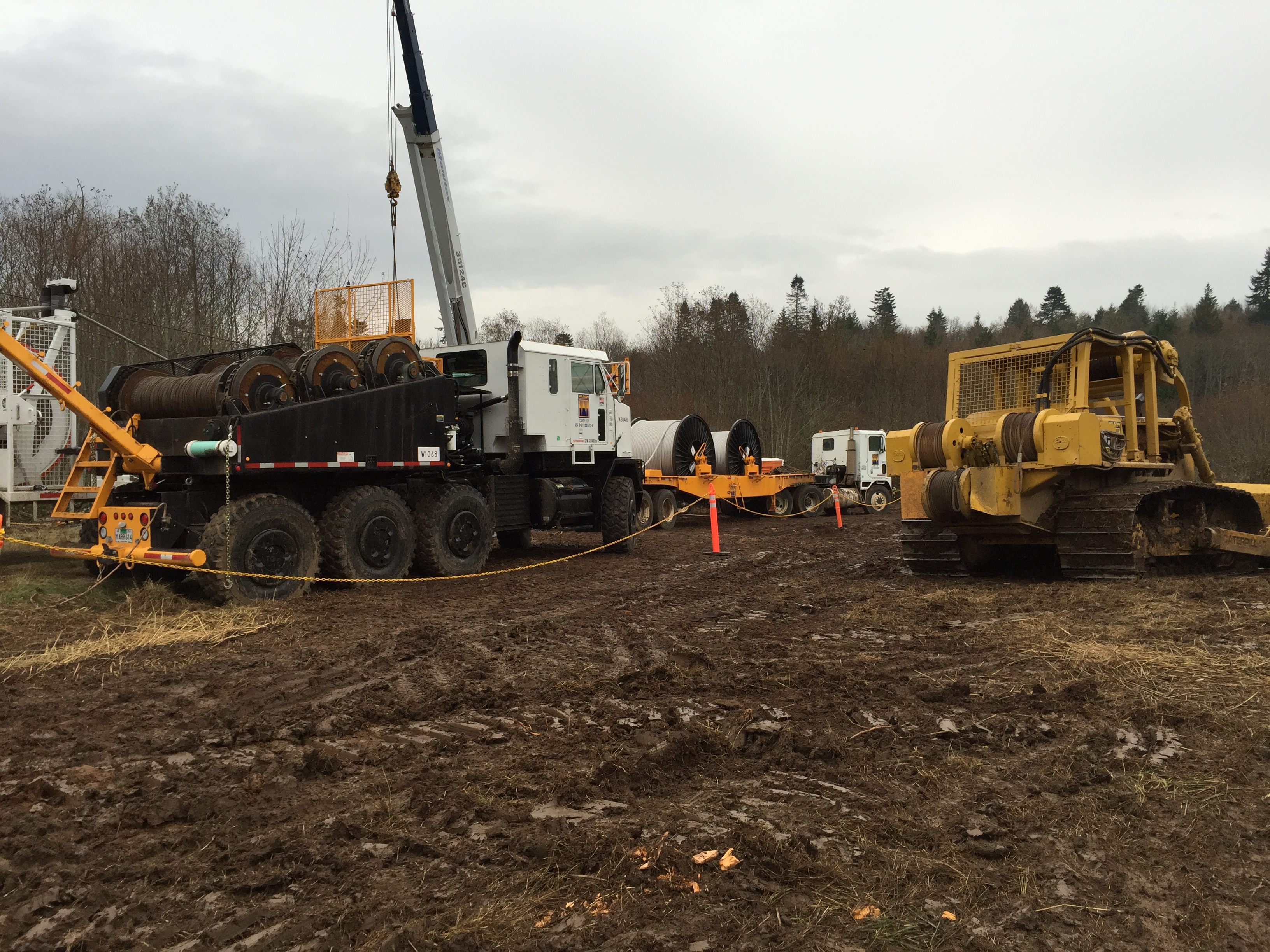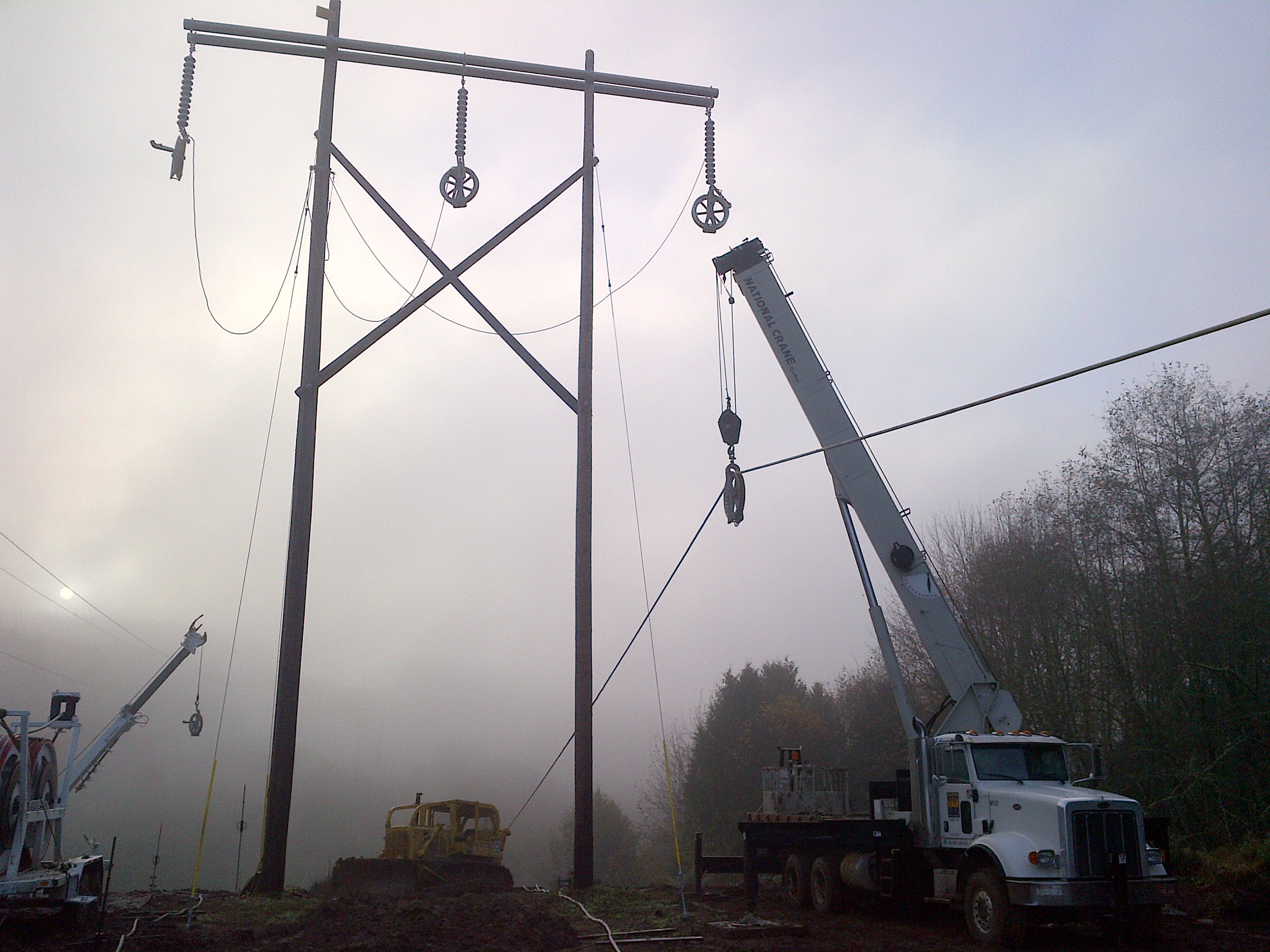 Crews took on the challenge while traversing steep terrain, heavy ruts, and a natural gas pipeline that navigates the center corridor of two 230kV transmission lines. Track-wheeled buckets, excavators and line equipment were brought to the project to trek through the muddy countryside.